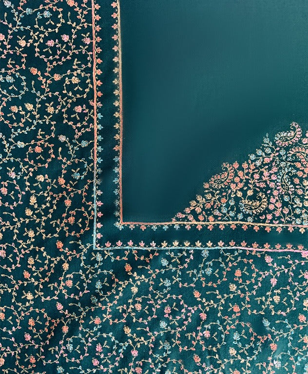 Elevate your wardrobe for winter with this traditional pashmina shawl, featuring and floral design on a rich green base.